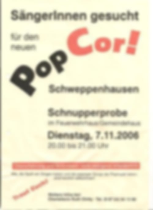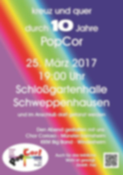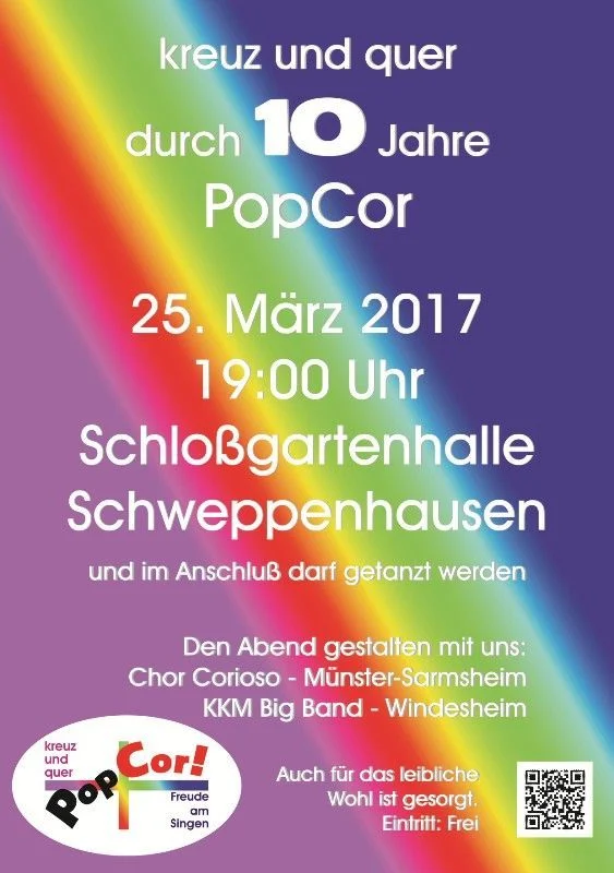 Ziel war es, A-capella- Liedsätze englischer Popmusik der 60iger bis 80iger Jahre mit viel Pep, Rhythmus und Spaß zu singen. Der Name „ PopCor!“ bedeutet in dieser Schreibweise„Popmusik ist spitze!“.
